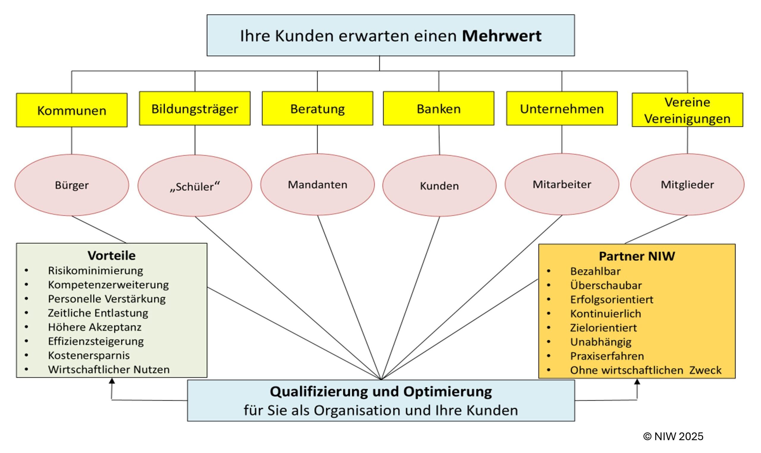 NIW verbessert in der Wirtschaft und in den Kommunen, wie durch Projektmanagement Effizienz und Produktivität optimiert werden können. Viele ursächlich organisationsinterne Aufgaben könnten besser in Projekten mit externen Partnern erledigt werden.