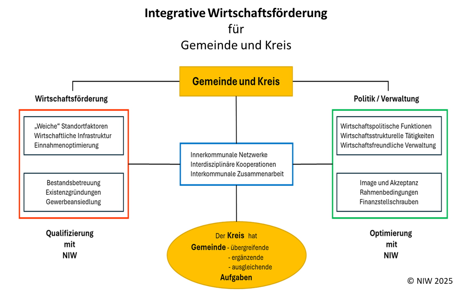 NIW versteht darunter ein eng verbundenes, wechselseitige Abhängigkeiten und unterschiedliche Aufgaben berücksichtigendes Gesamtsystem des Zusammenwirkens in der Kommune. Integrative Wirtschaftsförderung ist für die positive Entwicklung der Kommune entscheidend und bedarf daher politischer Steuerung(Controlling)