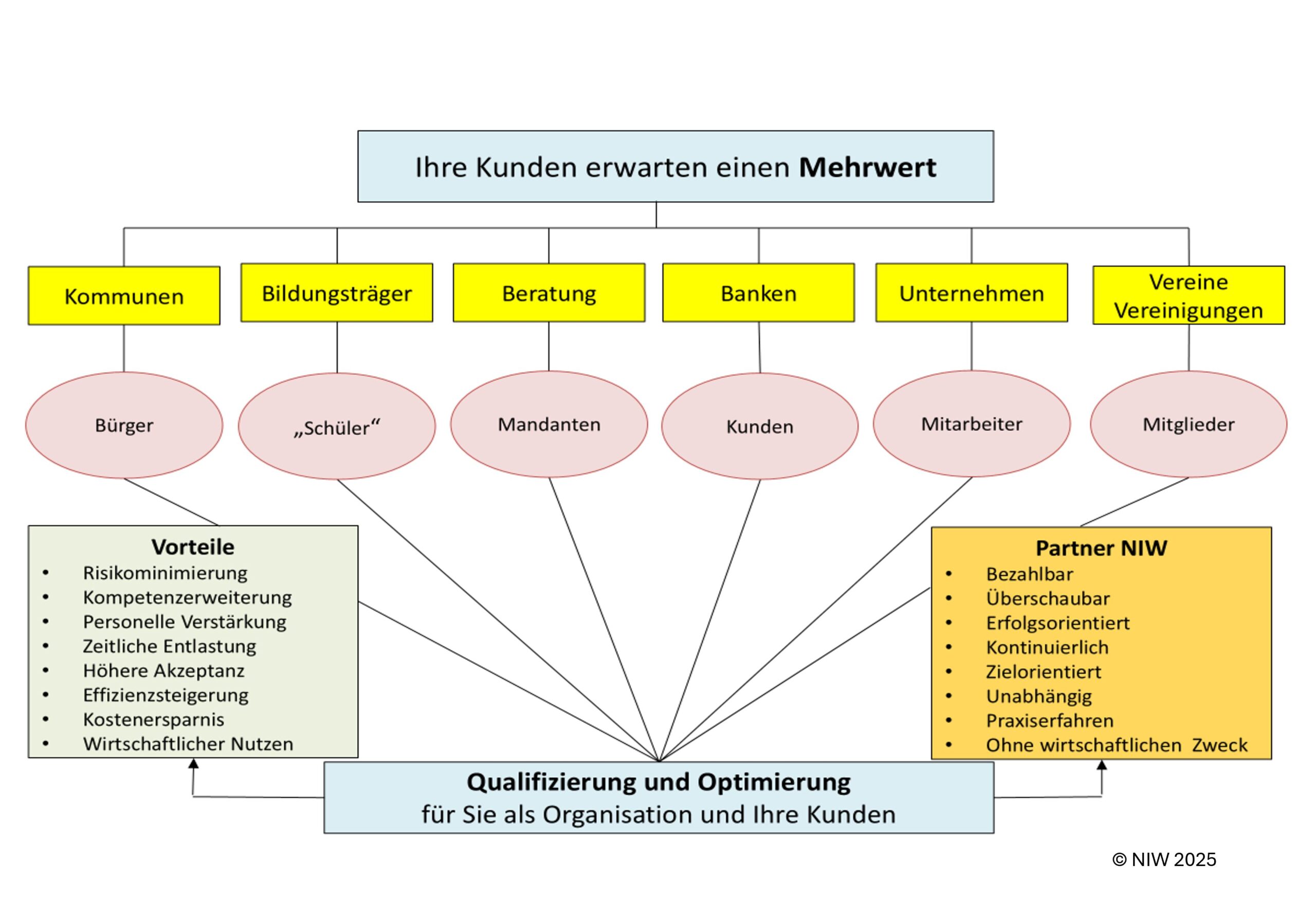 NIW verbessert in der Wirtschaft und in den Kommunen, wie durch Projektmanagement Effizienz und Produktivität optimiert werden können. Viele ursächlich organisationsinterne Aufgaben könnten besser in Projekten mit externen Partnern erledigt werden.